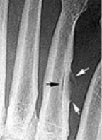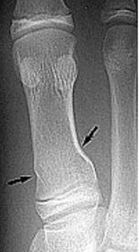 Describe what the arrows are showing | Torus fracture of the 1st met. "Buckling" of the proximal one third diaphysis is seen both medially and laterally. Common in paediatric patients |