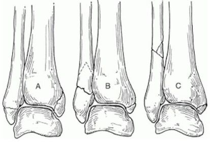 What classification system is this? Describe the 3 classifications | Weber Ankle Fracture Classification A = Fracture below syndesmosis B = Fracture begins at joint level & extends proximally in an oblique fashion C = Fracture above the joint line |