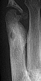 What disease is this? What causes it? | Brodie's abscess - chronic bone abscess caused by organisms of low virulence. Patient most likely did not go through an acute phase (just chronic osteo) |