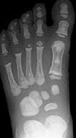 What deformity is this? | Metatarsus Adductovarus (ladder like arrangement of the metatarsals in lateral view) |