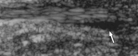 What does the arrow indicate? | A cleft (tear) in the tendon |