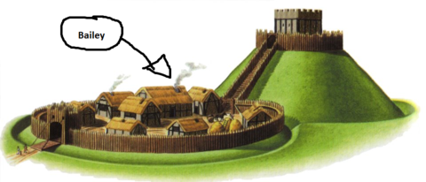| Bailey | Flat area below the Motte, surrounded by fence and moat. Housed soldiers and horses |