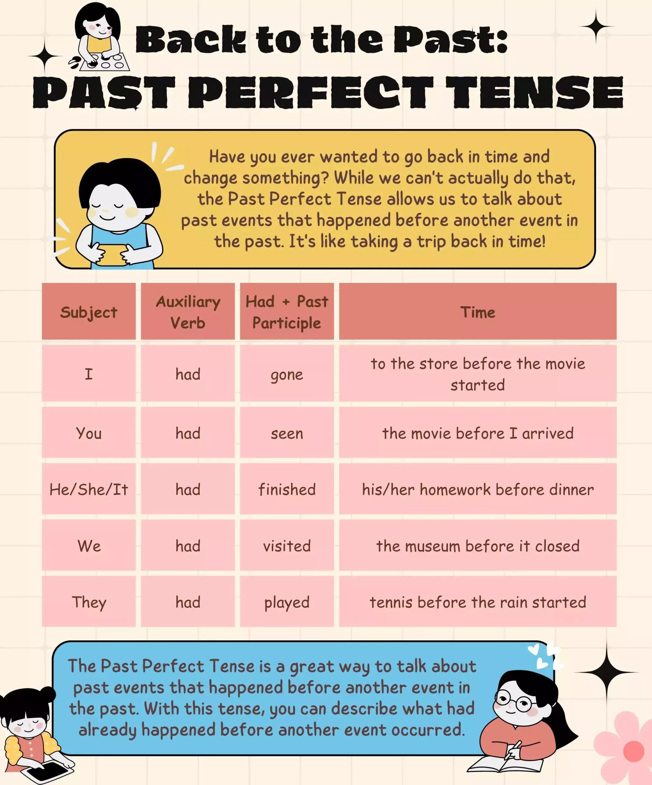 Usamos o past perfect quando: 1- Queremos dizer uma ação que aconteceu antes de uma outra específica (The plane had flown when i arrived at the airport) | |