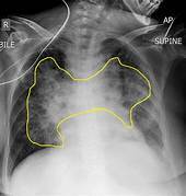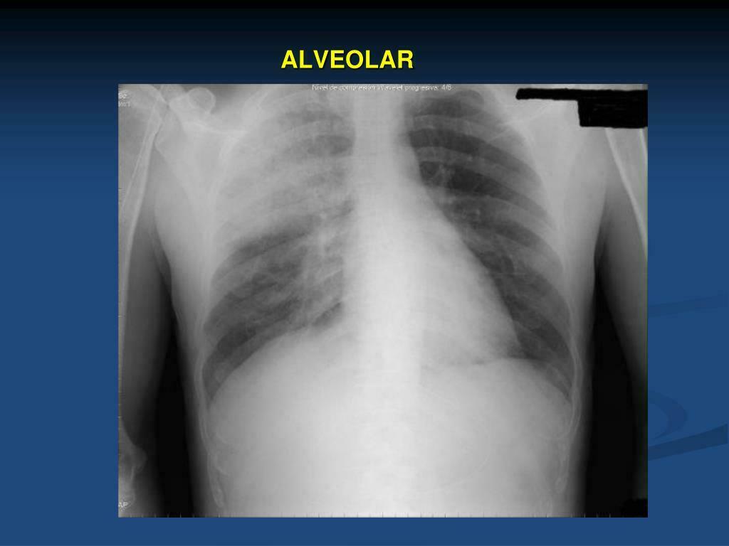 Opacidade alveolar bilateral em campos pulmonares médios. -Diminuição simétrica da transparência pulmonar perto do hilo, poupando periferia -Significa edema alveolar extenso em edema agudo de pulmão/ICC. -Infiltrado que preserva a periferia. |