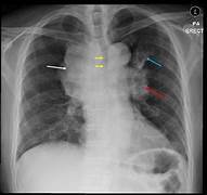 | Quais são as características radiológicas da Dissecção de aorta? Quais outros exames podemos pedir para vizualizar? | perda do contorno do botão aórtico e alargamento do mediastino, mas alguns têm rx normal. Ecotranesofágico!, AngioTC de tórax, Angioressonância |