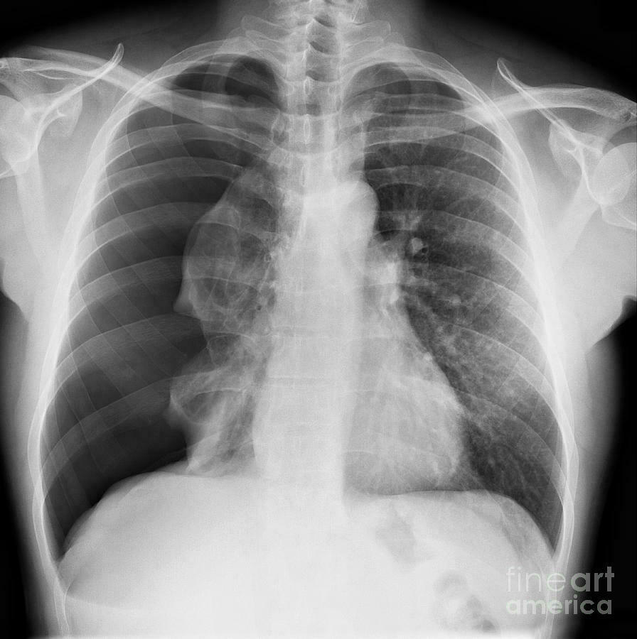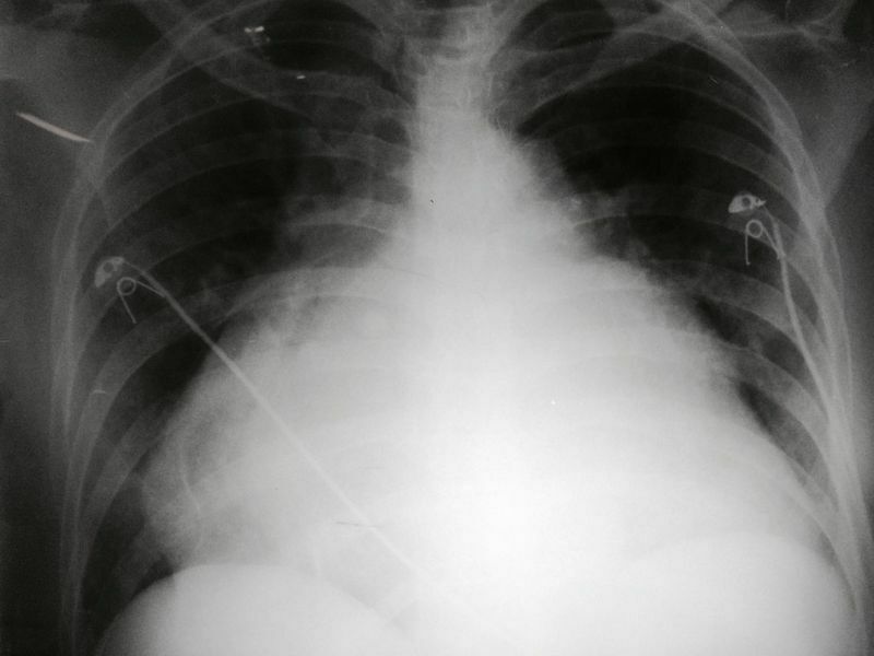 | O que esse raio x sugere e quais são as os sinais presentes? | Derrame pleural; Imagem em menisco, parabola de Demousiau, opacificação do espaço pleural, deslocamento do diafragma, imagem em menisco, fissuras pleurais e leve deslocamento do mediastino. |