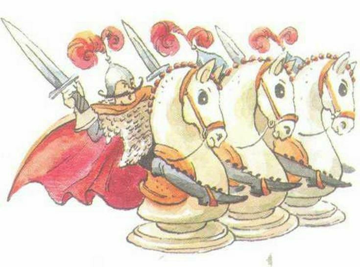 Отрывок из неоконченной сказки Александра Пушкина, написанной в 1833 году. В нём рассказывается о волшебных действиях царя над войском, стоящим на шахматной доске. Царь расставляет восковых солдатиков, которые во всём как настоящие — и лошади у них, и плащи, и перчатки. | «Царь увидел пред собою» |