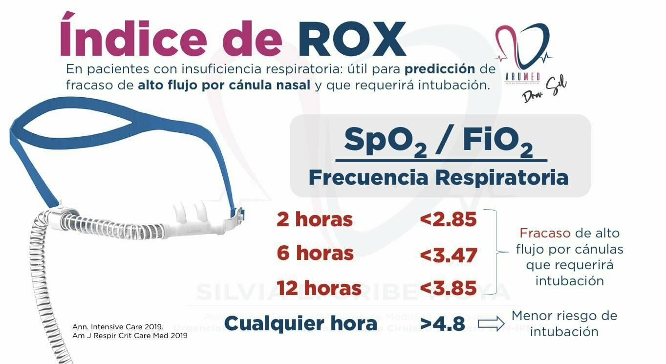 | ¿Qué es el índice ROX y para qué sirve? | Es un índice que evalúa la efectividad de la oxigenoterapia y se mide a las 2, 6 y 12 horas. |