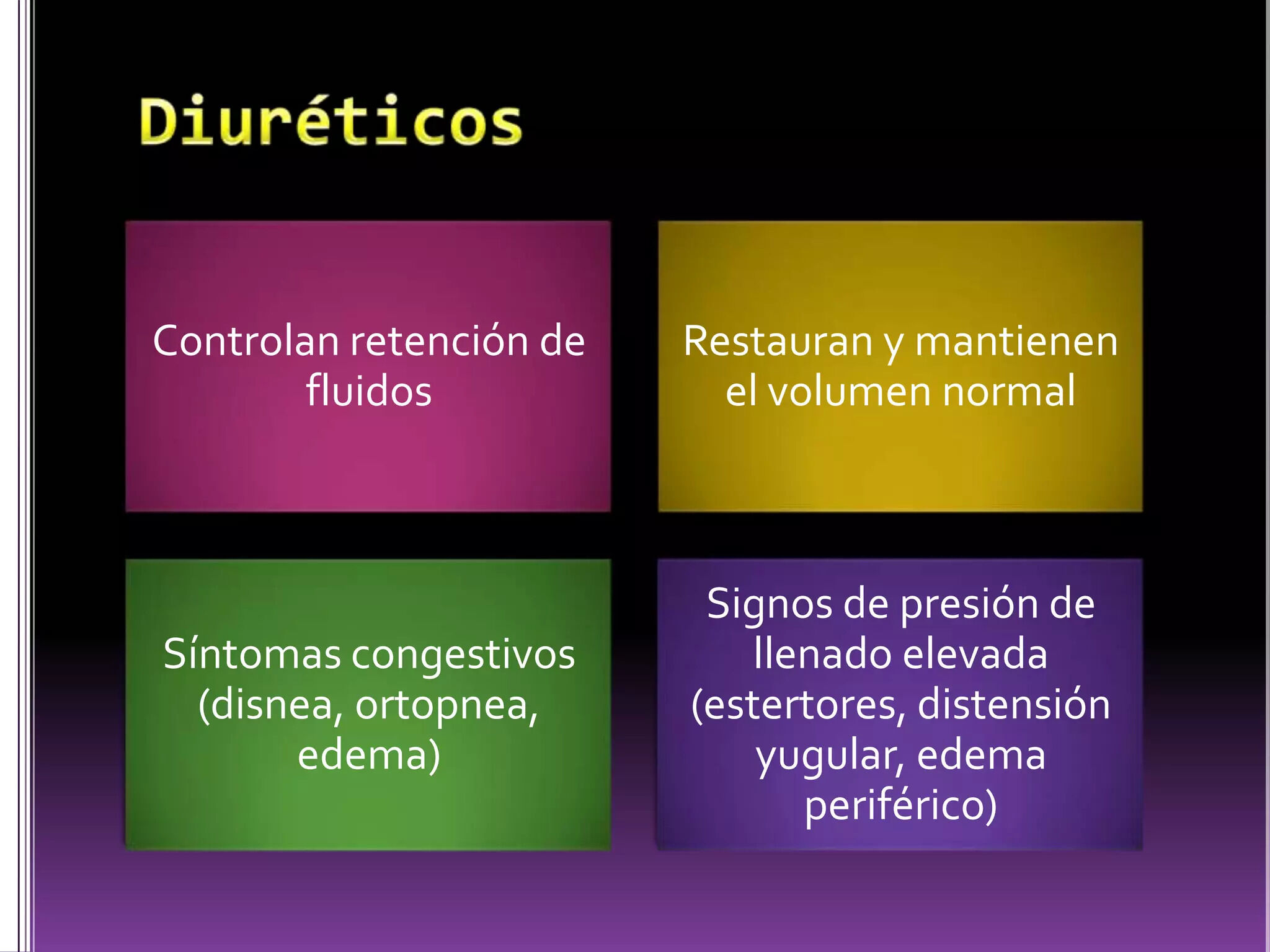 | ¿Cuál es el objetivo principal del uso de diuréticos en IC? | Disminuir la congestión y edema, mejorar disnea. |