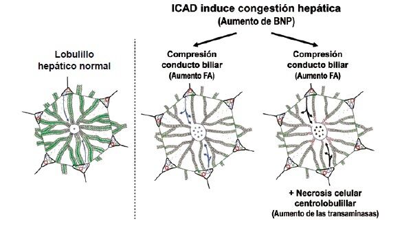 Congestión hepática por IC derecha que conlleva a daño hepatocelular leve.