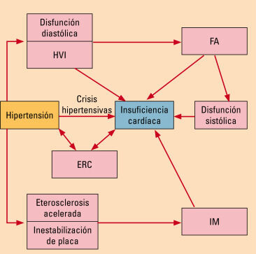 | ¿Qué repercusión tiene la hipertensión crónica en la evolución de la IC? | Provoca remodelado ventricular y rigidez de las paredes, contribuyendo a la disfunción cardiaca. (de hipertrofia a dilatación) |