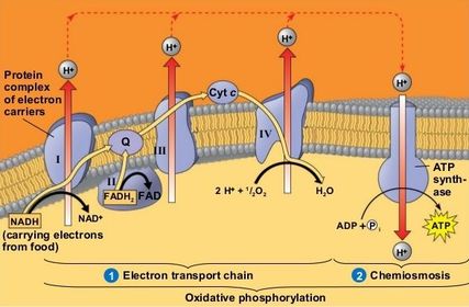 | What are the two processes of oxidative phosphorylation? | The two processes involved in oxidative phosphorylation are: 1. The electron transport chain 2. Chemiosmosis |