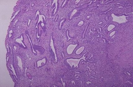 | where am I from the universe o.O?! TISSUE TYPE: see glands and stroma... UTERUS PATHOLOGY: hyperplastic glands with different sizes and shapes DIAGNOSIS: endometrial hyperplasia KEY: FIND THE SWISS CHEESE XD.. | |