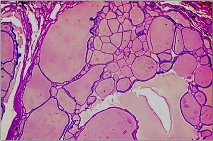 | TISSUE TYPE: glands filled with colloid PATHOLOGY: glands increased in size , stretched with colloid (flat epith.) DIAGNOSIS: Nodular Goiter KEY: homogeneous big pinky patches everywhere everywhere ^^ (so unique) | |