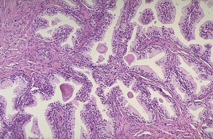 | TISSUE TYPE: gland and stroma... specific glands of prostate PATHOLOGY: hyperplasia of gland and stroma DIAGNOSIS: benign prostatic hyperplasia KEY: U CAN SEE CORPORA AMYLECIA | |