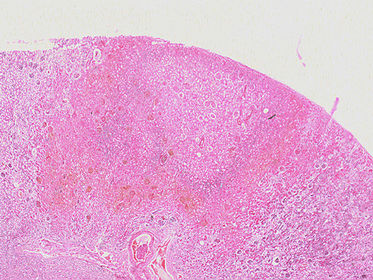 | TISSUE TYPE: lymphocyets every where... where am I ??? xD PATHOLOGY: inflamatory granuloma with caseation in the center .. eosinophilic Langhan's cells (an orphan cell in the center) ^^ DIAGNOSIS: tuberculous lymphadenitis KEY: LYMPHOCYTES + CASEATION | |