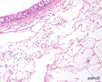 | TISSUE TYPE: by epith. which doesn't exist here xD ... respiratory .. or can be squamous due to metaplasia... NOSE PATHOLOGY: inflamatory cells of Mickulicz and Russel bodies in plasma cells (more eosinophilia) in lower part of section DIAGNOSIS: Rhinoscleroma KEY: RUSSEL BODIES | |