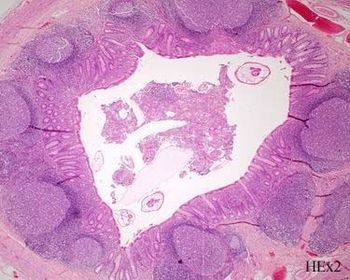 | TISSUE TYPE: circular organ .. with lymph follicles .. u see the complete circle... APPENDIX PATHOLOGY: necrotizing tissue in the lumen ... hyperplastic lymph tissue DIAGNOSIS: acute suppurative appendicitis KEY: COMPLETE CIRCLE | |
