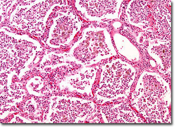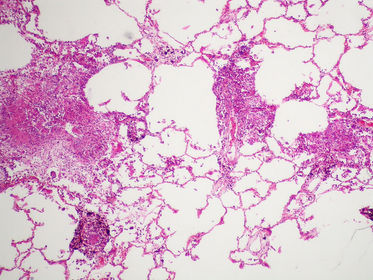 | TISSUE TYPE: dots on white page :D... white page= alveolar spaces.. u can see carbon particles (anthracosis)..LUNG PATHOLOGY: inflamatory cells in alveolar spaces .. DIAGNOSIS: acute lobar pneumonia KEY: WHITE BACKGROUND .. | |