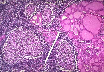 | TISSUE TYPE: colloid of..... THYROID PATHOLOGY: inflammatory cells, hyperplastic lymphoid follicles, cells lining acini called oncocytes ,Hurthle or askanazy cells DIAGNOSIS: Hashimoto's thyroditis KEY: ACINI + LYMPH FOLLICLES N.B: differentiate it from Goiter (no lymph follicles) | |