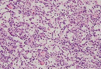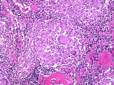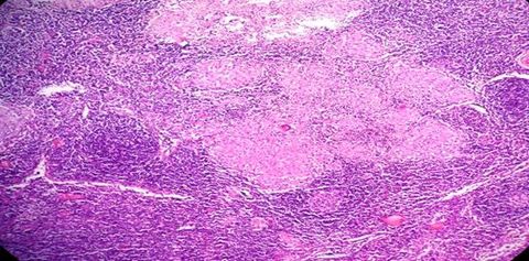 | TISSUE TYPE: lymphocytes every where ... lumph node PATHOLOGY: granuloma with NO caseation .. langhan's cells (with horse shoe arrangement of nuclei) are seen and epithelioid cells.. DIAGNOSIS: Sarcoidosis N.B: NO caseation in contrary to TB. special charecters : Schaumann and asteroid bodies (Don't even think about seeing them xD).. may be isolated in a question . | |