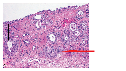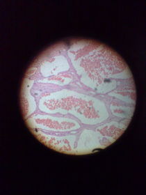 | TISSUE TYPE: u can see transitional epith. (not clear here) ... urinary bladder PATHOLOGY: black arrow: cystitis cystica red arrow: Brunn's nest of course u will see ova (not clear here) DIAGNOSIS: blihariziasis KEY: OVA N.B: differentaite between bladder and ureter Bilhariziasis .. just ureter will be complete circle ..(with same epith. changes) .. in intestine u can see ova or even the worm itself and no epith. changes .. squamous metaplasia can also be seen | |