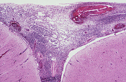 | TISSUE TYPE: Gyri and subarachinoid space... brain PATHOLOGY: inflamatory cells in subarachinoid space DIAGNOSIS: acute suppurative meningitis | |
