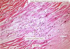 | TISSUE TYPE: periphrally we can see muscle fibrs .. HEART PATHOLOGY: centrally .. fibrosed area with some inflamatory cells DIAGNOSIS: myocardial infarction (healed by fibrosis) KEY: VIABLE PART OF MUSCLE AND FIBEROSED PART | |