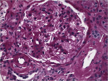 | TISSUE TYPE: glomeruli... kidney PATHOLOGY: depsition of foreign material in wall of capillaries .. DIAGNOSIS: Amyliodosis ( can be found in tubules ... afferent arterioles or in interlobular a.) N.B: Amyloidosis in kidney... sarcoidosis in lymph nodes.. | |