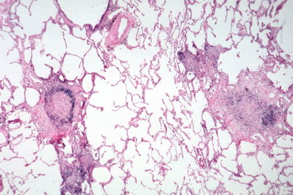 | TISSUE TYPE: alveolar spaces ... LUNG PATHOLOGY: abnormal tubercle between alveoli ... consist of epithelioid cells and langhan's gaint cells .. and caseation DIAGNOSIS: TB of lung N.B: differentiate it from pneumonia .. (solid pink masses between alveoli NOT dots IN alveoli..) | |