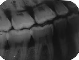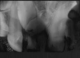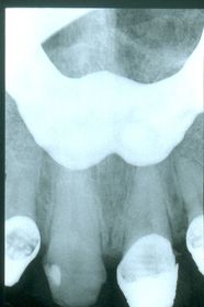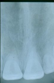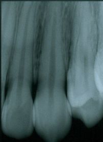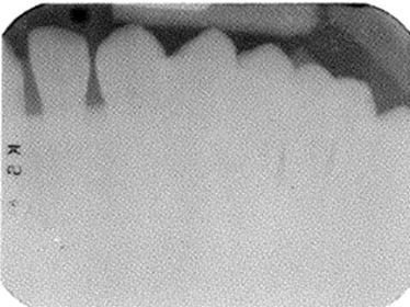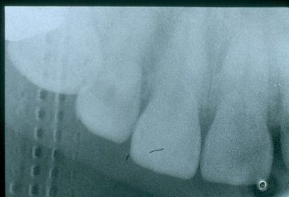 Radiogafía a revés | Las lineas entrecortadas que se aprecian a la izquierda muestran que la laminilla de plomo se coloco hacia el área vestibular y no palatal. |