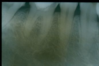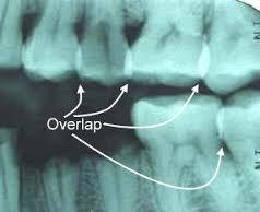 Radiografía Sobre expuesta | Los interproximales no se pueden apreciar ya que el cono de la máquina no dirigió los rayos centralizados y cada pieza dental cubre a la adyacente. |
