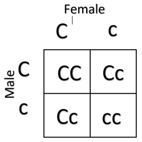 Draw a genetic diagram to the genetic make up of the offpring of a male parent with the genotype Cc and female with genotype Cc | |