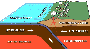 | When 2 plates collide, one normally slides underneath. Why does this occur? | In a subduction zone of a convergent boundary, the subducting plate, which is normally a plate with oceanic crust, moves beneath the other plate, which can be made of either oceanic or continental crust. Where a dense oceanic plate collides with a less-dense continental plate, the oceanic plate is typically thrust underneath because of the greater buoyancy of the continental lithosphere, forming a subduction zone. |