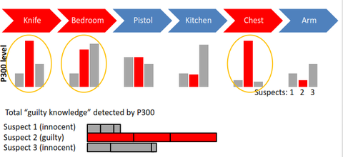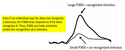 GKT "guilty knowledge" | for 2/3 of knowledge, had higher P300 levels -an innocent person would have little to no recognition of crime stimuli, and therefor have small P300 levels |