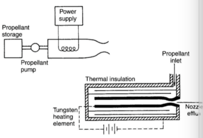| How does a resistojet work? | Ohmic heating of a working fluid by heaters incorporated in ducting. Sometimes used to augment heat of dissociation of monopropellants, possible synergy with disposal of fluid waste. |