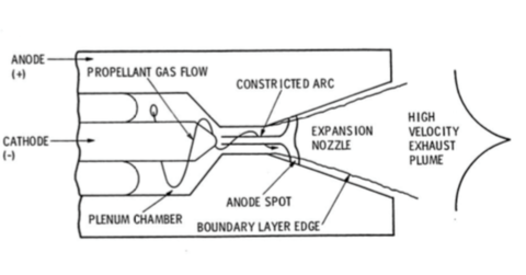 | How does an arcjet work? | Ohmic heating of a working fluid through an electric arc (T~1000K), usually struck between axial electrode and nozzle throat |