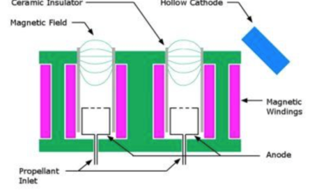 | How does a Hall effect plasma thruster work? | Uses electrons orbiting in radial magnetic field to generate Lorentz force on Xenon ions to propel them backwards. |