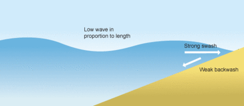 | constructive wave- smaller in height= less energy strong swash- pushes material up the beach. weak back wash- little erosion. | |
