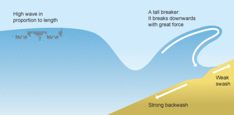 | destructive waves- very tall- a lot of energy weak swash- little beach building strong backwash- pulls sand/shingle down beach= starves beach | |