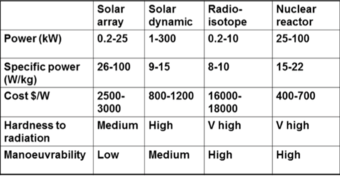 | Which power type is high/low in power, specific power, cost, hardness to radiation and maneuverability? (don't need to know specific values just whether high or low) | |