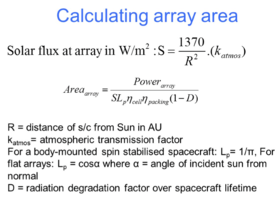 | How are solar arrays designed in order to obtain required power? | Arrays are constructed in series in order to achieve required voltage. Then they are stacked up in parallel in order to create the current required and therefore power. |
