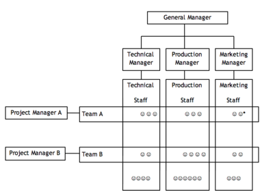 | Who would the person with the asterisk next to them report to? Who is responsible for their work in this matrix structure? Project manager A or Marketing manager? Answer: Likely to report to both, project manager responsible for project contribution and department manager for his general career, development, pay and promotion prospects. | |