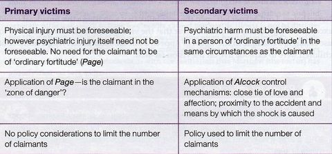 Primary victim (PV) | Those who are within the zone of physical danger. There is presumed to be a duty of care not to cause them physical injury and this is extended to include a duty not to cause them mental harm. They can recover for any psychiatric injury, regardless if they suffered physical one. Even when it was not reasonably foreseeable. |