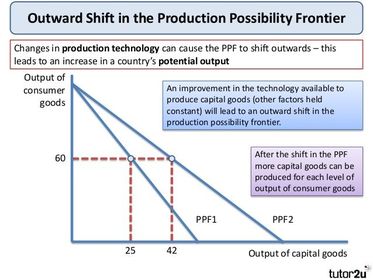 | When will the PPF shift outwards? | improvements in productivity and efficiency from new tech or advances in the techniques of production more factors of production being available and used discovery of new natural resources better management of factor outputs |