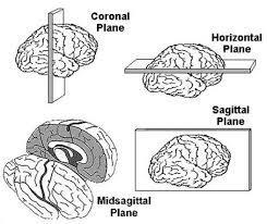 | Name the three techniques of slicing the brain. | Horizontal, Sagittal and Frontal (creating a horizontal, Sagittal and Transverse slice). |