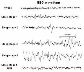 | Describe EEG patterns through stages 1-4. | increases in amplitude and decreases in frequency |