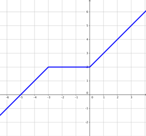 | has three linear sections, first degree two sections are increasing middle section has no slope the two slanted sections have the same slope as the red graph made up of straight lines domain and range: all real numbers | |