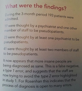 | Two studies were carried out but study 1 was the most important. The pp's in study 1 were NOT THE PSEUDO PATIENTS! They were the staff of the hospitals. | The pseudo patients were 5 men and 3 women with various different occupations who used fake names and occupations to sought admission into 12 hospitals across the USA. |