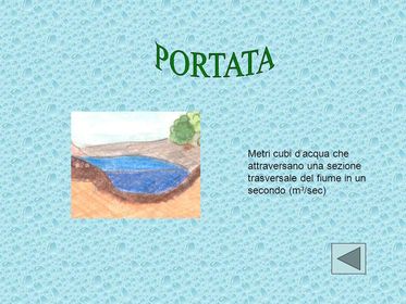 | portata | E' IL VOLUME DI ACQUA CHE PASSA ATTRAVERSO UNA SUA SEZIONE IN UN DETERMINATO TEMPO. |
